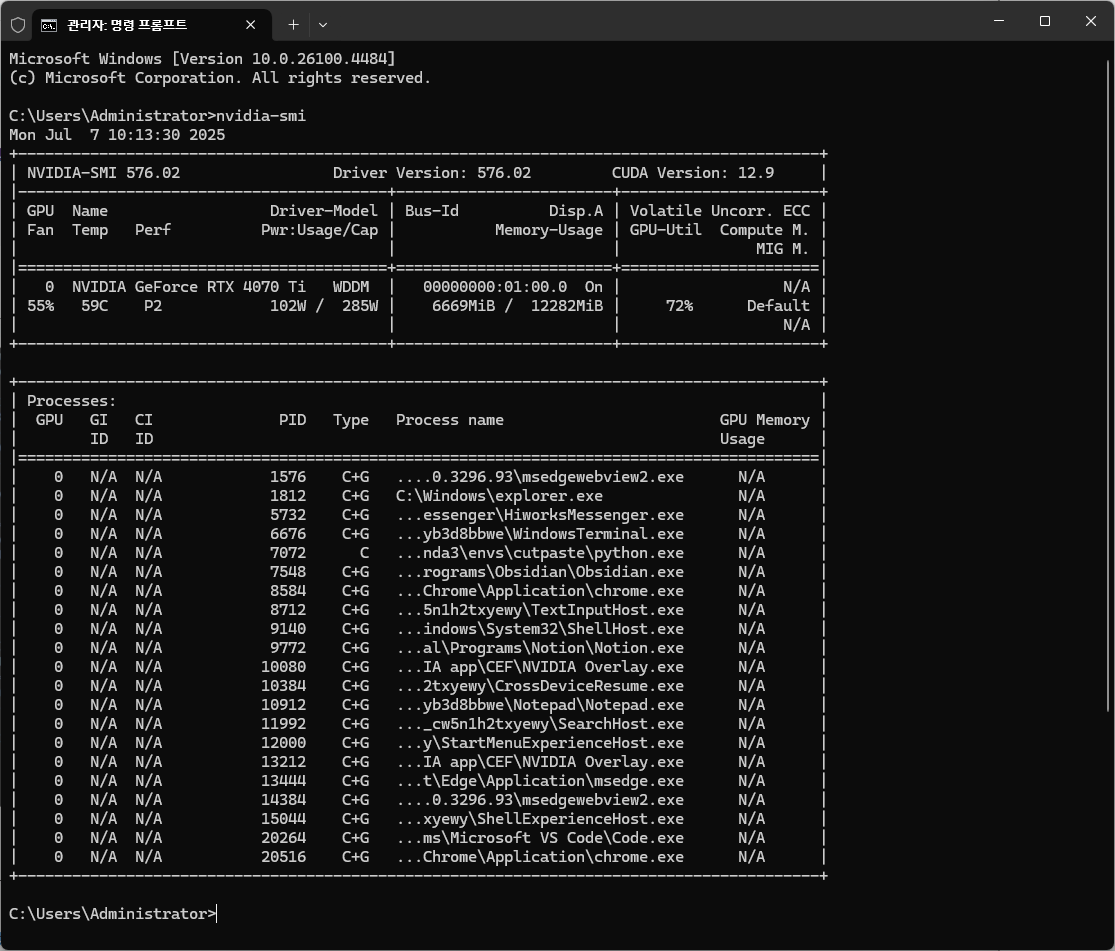 해당 PC는 GPU가 1개 내장되어있으며, GPU = 0, NVIDIA GeForce RTX 4070 Ti이다.